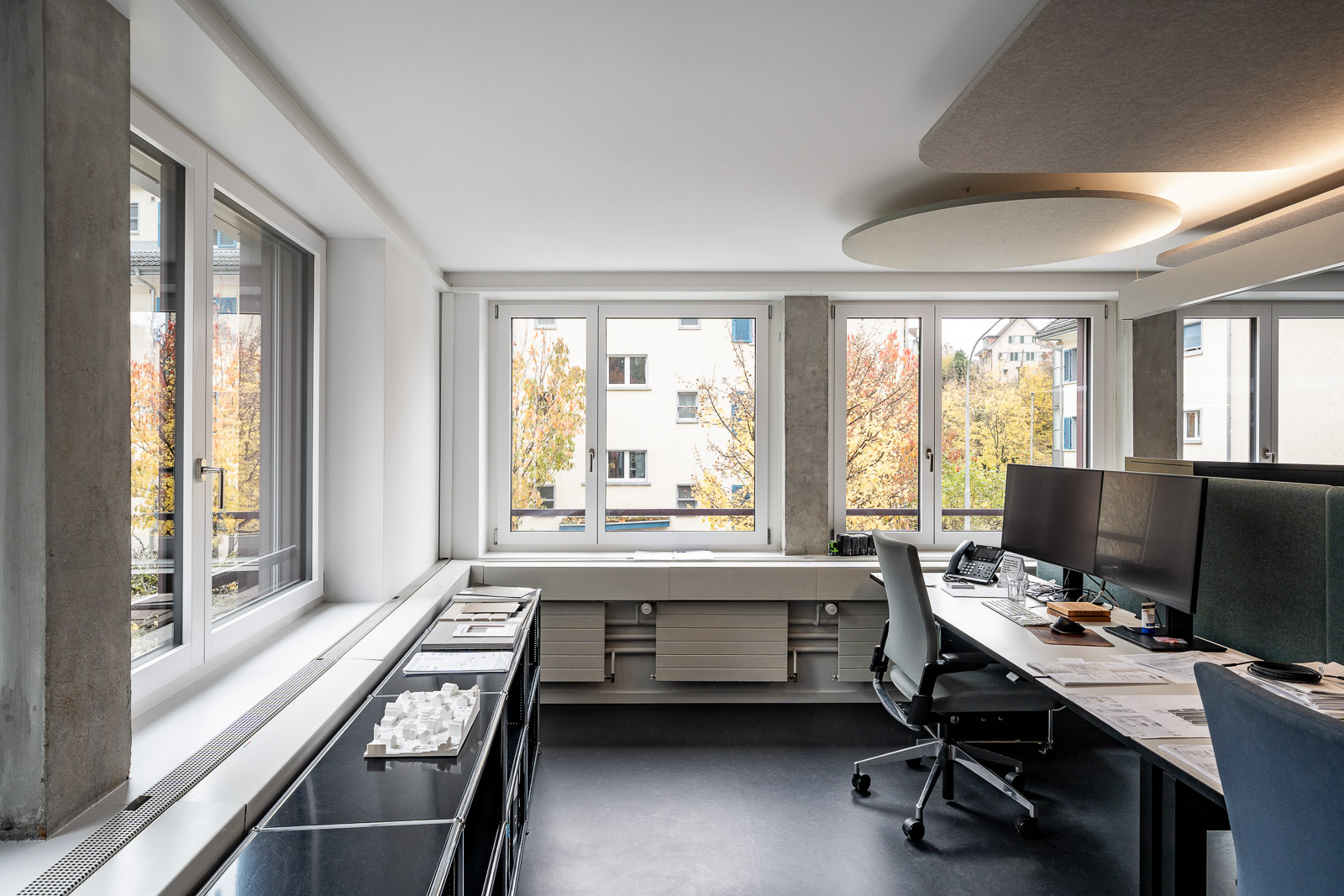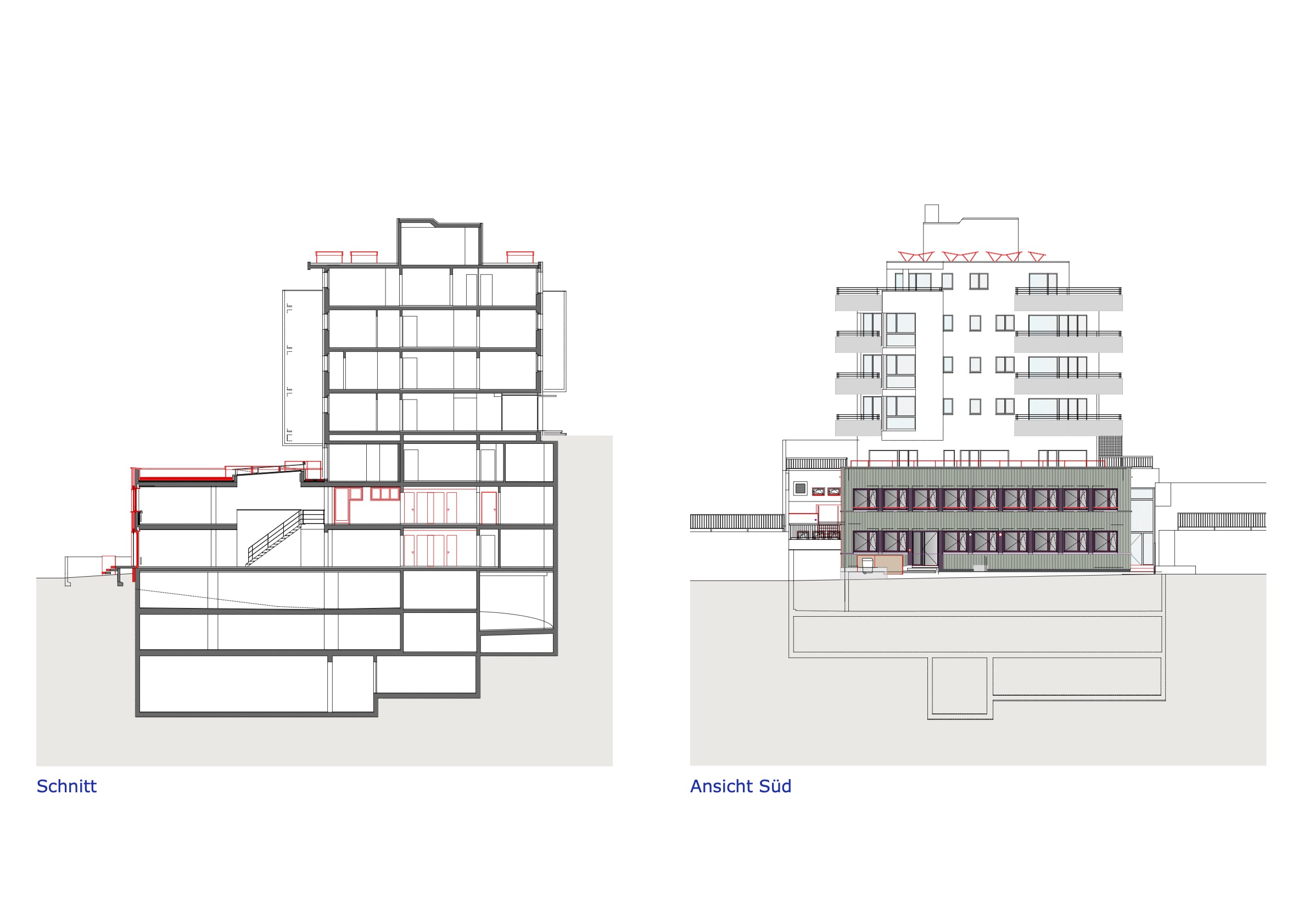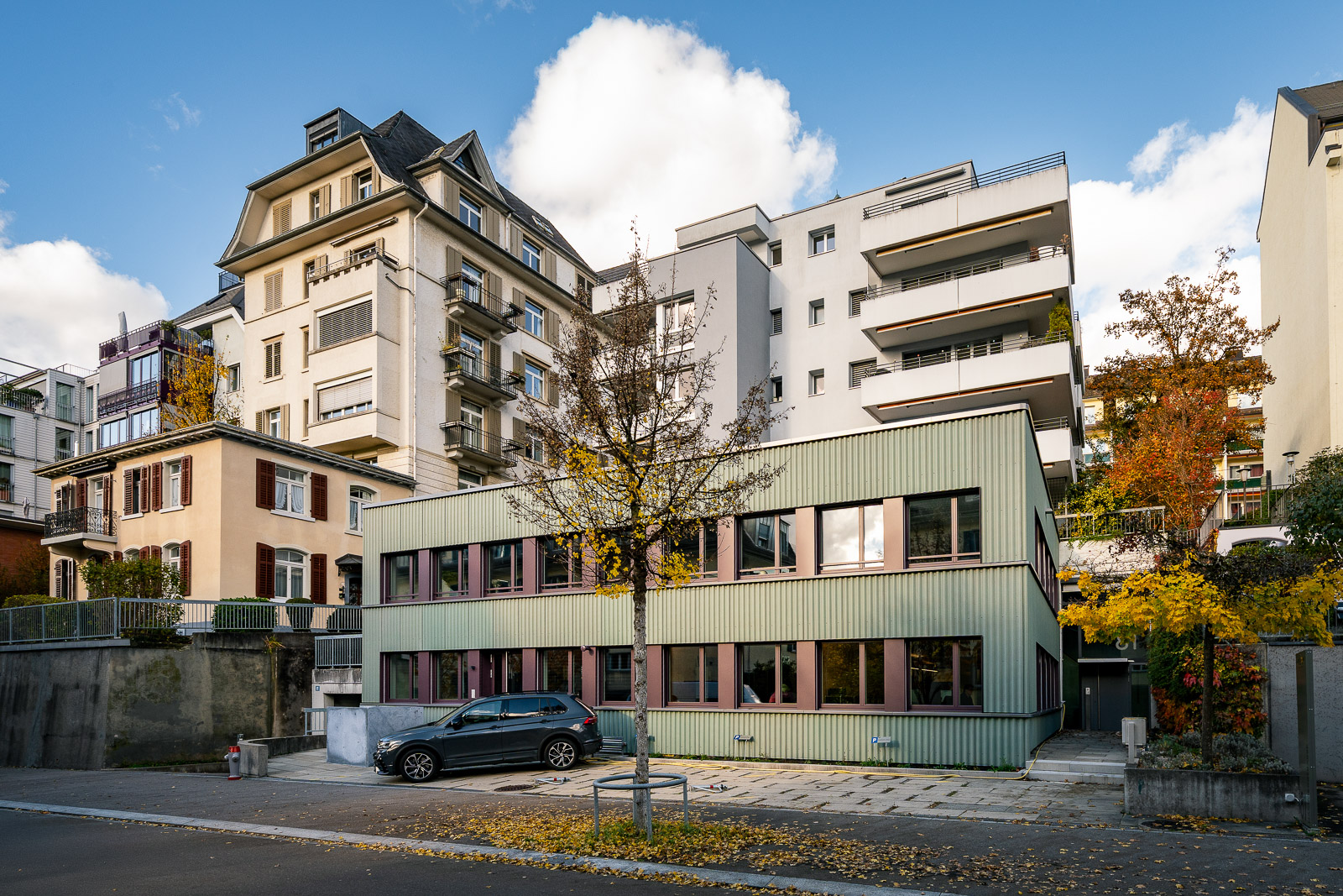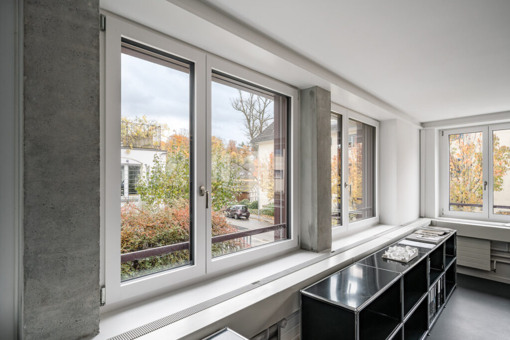 Der 2-geschossige Bürotrakt mit Baujahr 1979, dem Wohnhaus an der Forchstrasse 158 vorgelagert, hat im Bestand eine Sichtbetonfassade mit einem engen, hochformatigen Fensterraster.