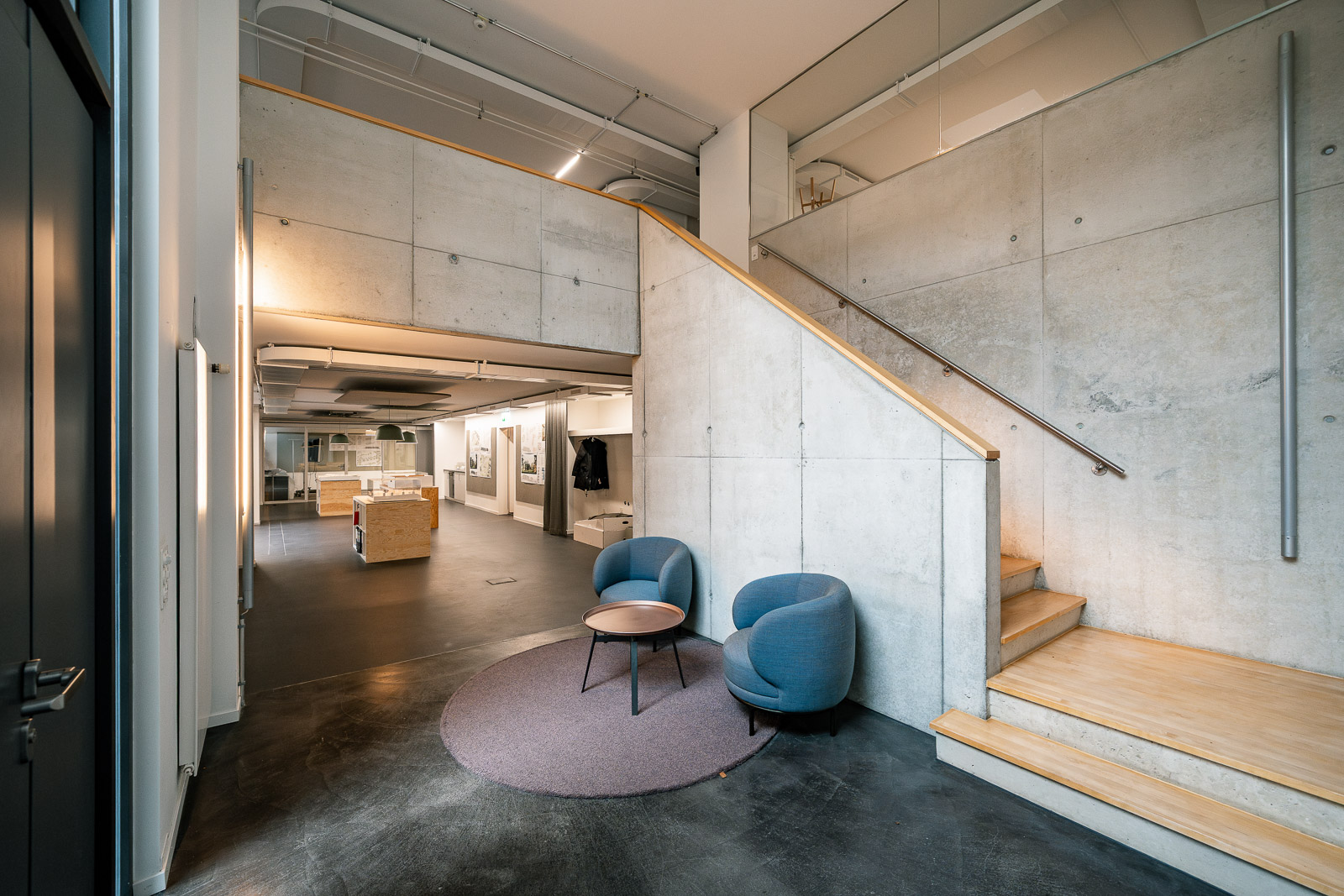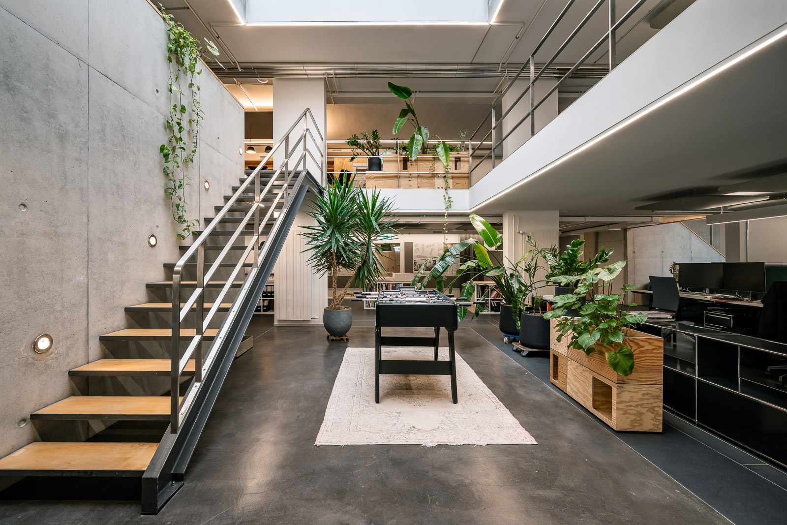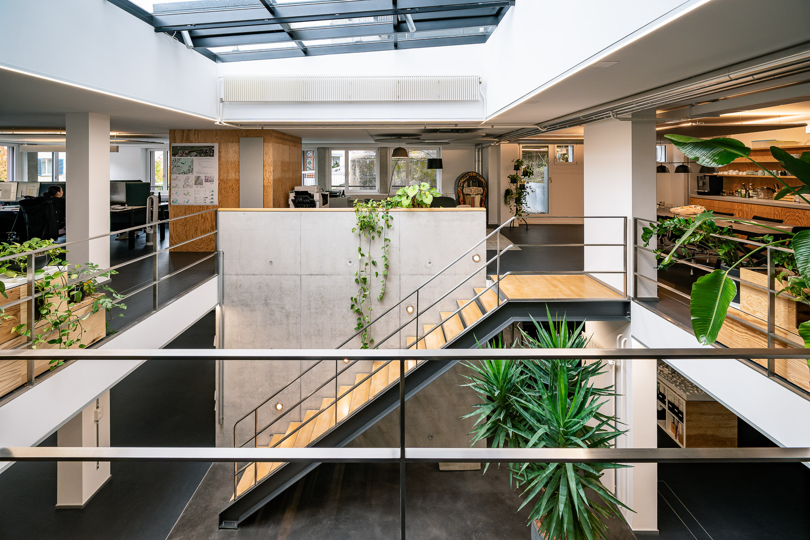 Die Innenräume werden entschlackt und die Bürotrennwände entfernt, was die zweigeschossigen internen Erschliessungsbereiche und das grosse Oberlicht in der Raummitte freispielt.