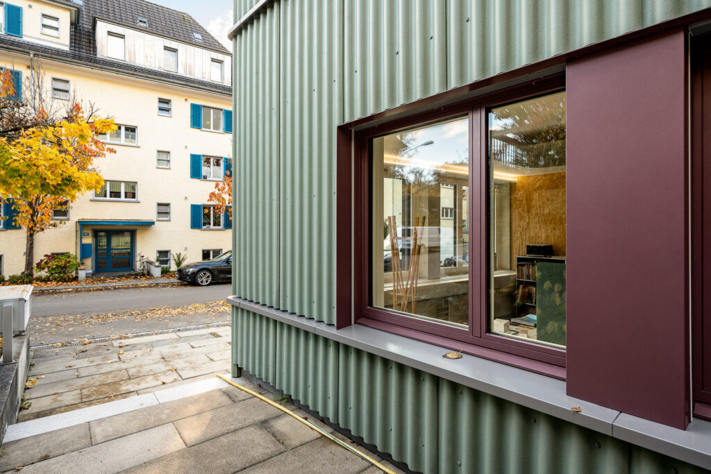 Die neue, isolierte und hinterlüftete Aussenhülle besteht aus vertikalen, grünen, lasierten Well-Eternitplatten und die vergrösserten Fensteröffnungen werden von Metallzargen im kontrastierenden Farbton «purple dust» gefasst.